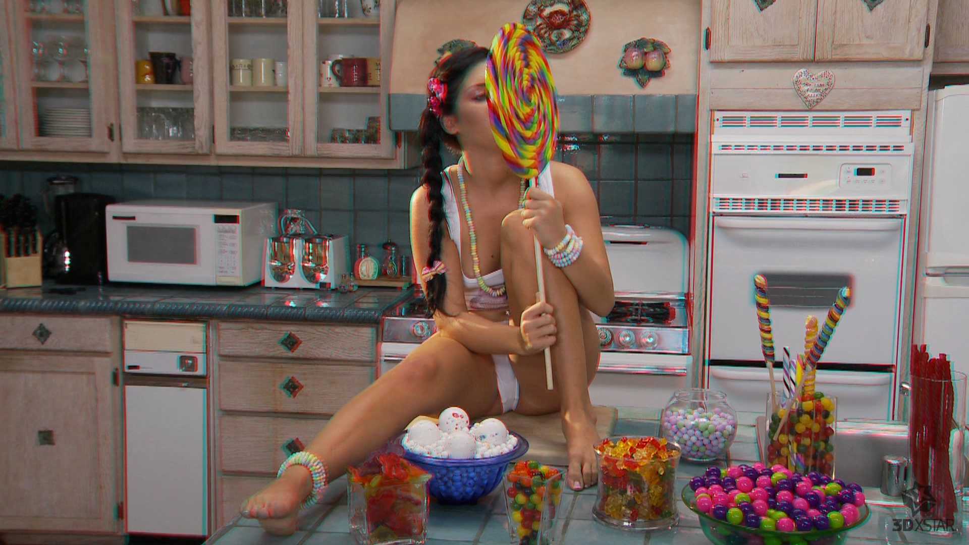 Bettina while playing with lollipops in the kitchen she gets horny and turned on, so she starts throwing all the candies to the floor and pushing the lollipop into her tiny pussy. this movie is renderen in red/cyan anaglyph 3d, meaning that you need those nerdy colored glasses to fully enjoy this 3D porn (you can pick them up for a couple of bucks on amazon, or even make them yourself... instructions can be found via google)